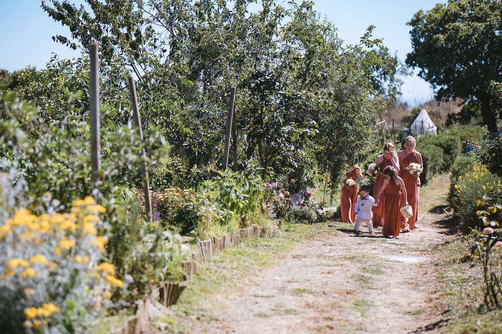 Centrotavola e archi di fiori di campagna, damigelle con mazzi di erbe aromatiche e fiori colorati.